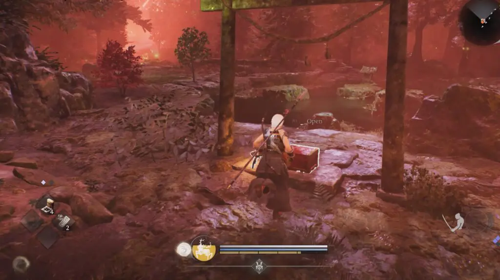 Follow the path southeast of the Forest of Souls Shrine. Keep an eye on the right side of the path. You will see a chest near a wooden arch and a small pond. Open the chest to obtain the Ninja’s Text.