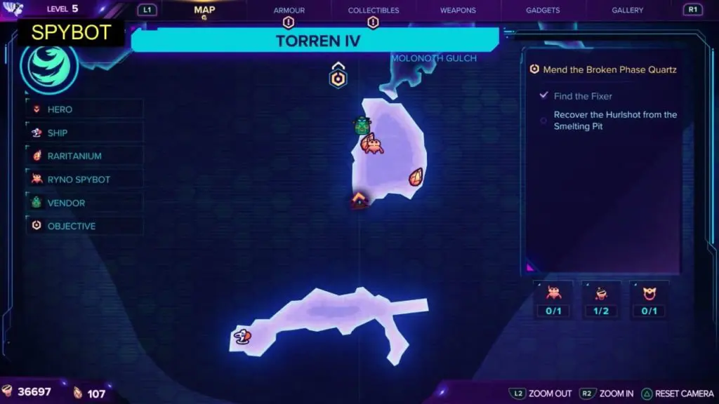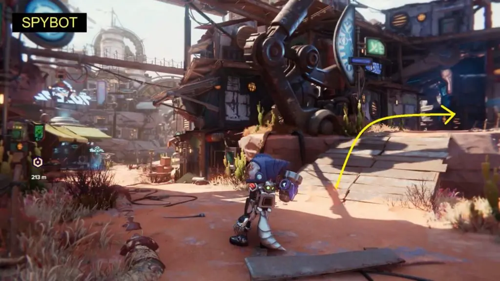 The Ryno Spybot is on the main island (the island with Ms. Zurkon weapon vendor). At the southernmost end of this island, there is an alley on the right side. Use the magnetic path at the end of this alley to go down to the lower area of the island. You’ll find Ryno Spybot at the end of this area (near Raritanium).