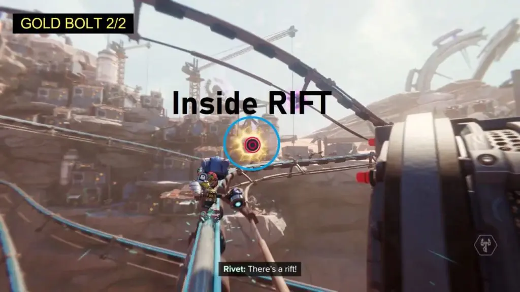 During the story objective “Recover the Hurlshot from the Smelting Pit” you’ll have to do a long rail grind (to reach the next island from the main island). During this rail grind, you’ll see a yellow rift on the left. Grappling to this yellow rift will teleport you to another rail (which has the Gold Bolt), and you’ll automatically collect the Gold Bolt.