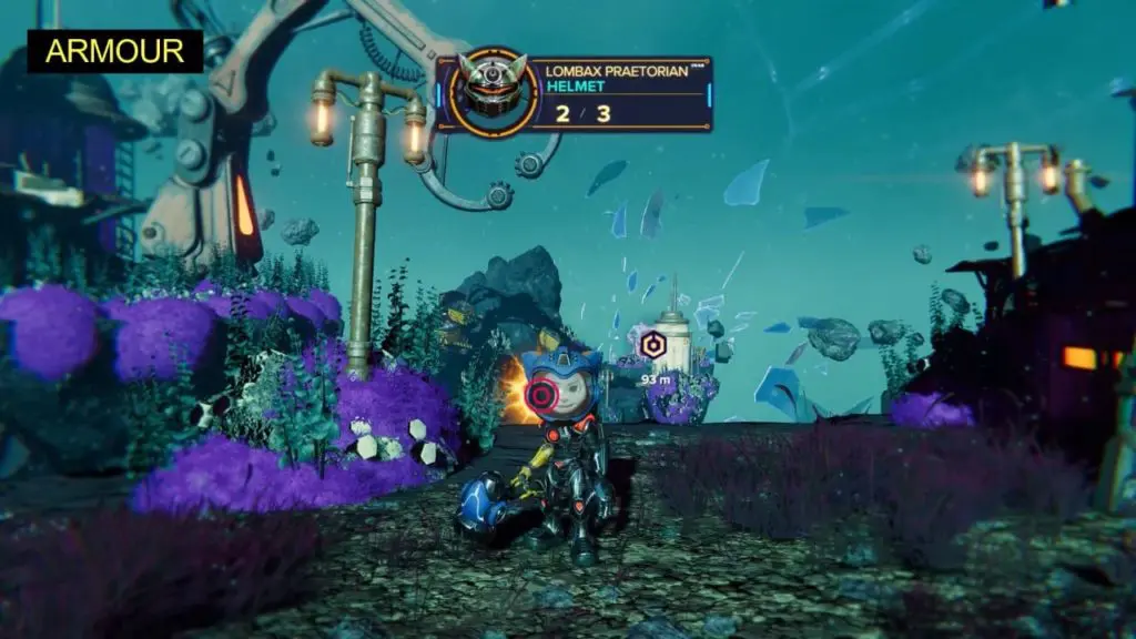The armor piece (Lombax Praetorian – Helmet) is at the end of this pocket dimension. You’ll need a ride to get to the armor. After entering the pocket dimension continue moving ahead on the rocky platform. At the end of the platform, you’ll find a nest on the right side. Hit the nest with your hammer to release a steed. Ride the steed and jump over the speed ramp to reach the armor. You need to spank the steed (by pressing R1) to boost its speed.