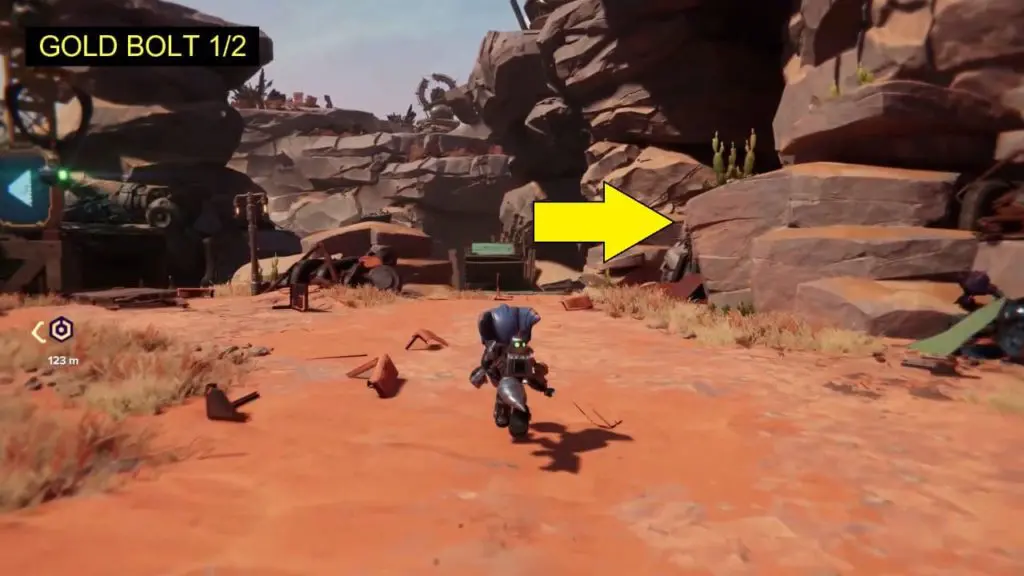 At the start of the planet, after moving ahead from your ship you’ll see a bifurcation in the path. Take the path to the right, into the cave (Note: the objective “Find the Fixer” will take you to the left). Use your hover boots to jump over the speed ramp. This path will lead to a wall run section. At the end of the wall run section, you need to use your grappling swing to reach the green-colored platform ahead which has the 1st Gold Bolt of this planet.