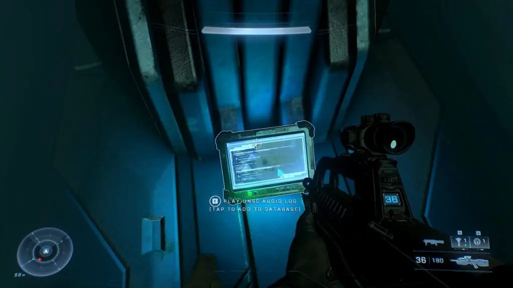 After activating the Gravity Lift, take it to the top of the tower. Here you will find the Mjolnir Armor. After interacting with it, take the ramp to the next level. You will find the audio log at the foot of a pillar on this level.