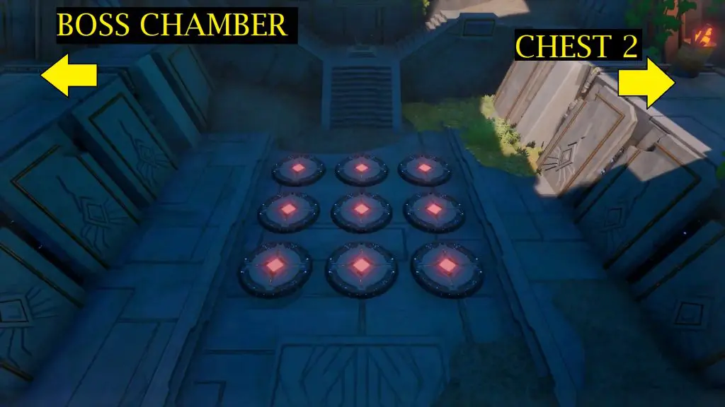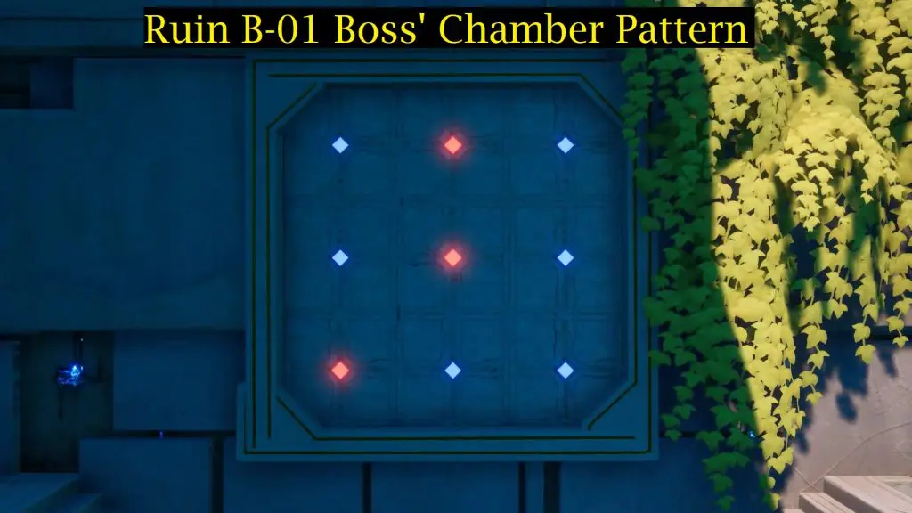 Continue to explore the ruin to reach a room with 9 switches and a board on the wall as shown in the below image. The panel displays the platforms players have to step on to open the door on the left to proceed to the boss’ room and end the Ruin.