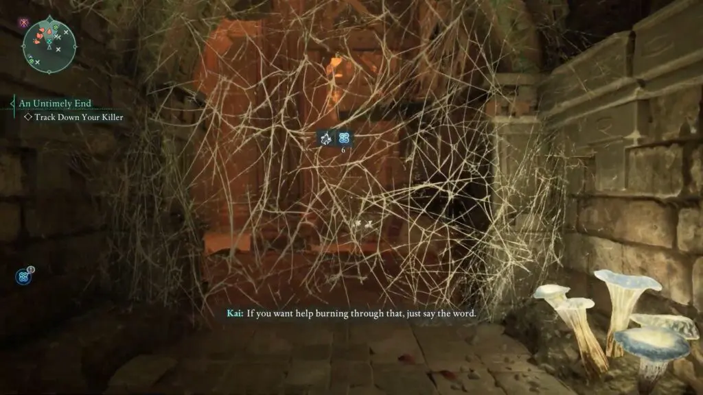 In the next room, move forward carefully, avoiding the pressure plate, until you reach a path blocked by webs. Burn the web, then head left to clear another path blocked by the web.