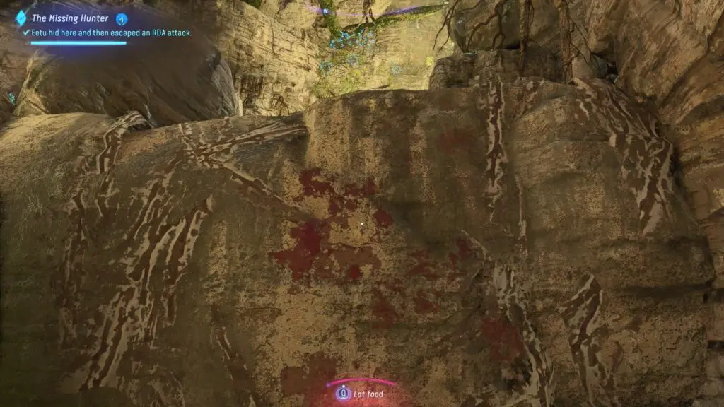 After you finish the investigation within Mender’s Cave, the wounded Ikran’s scent trail will be exposed on the cliff above the wall with blood and scratch marks at the back of the cave. Climb this wall to leave the cave and begin following the smell trail.
