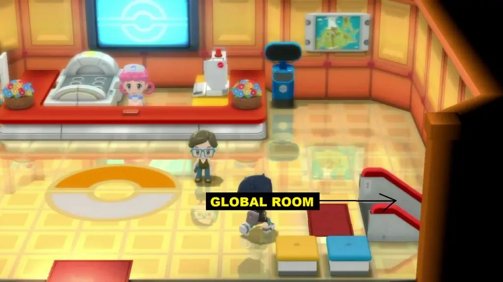 Inside the Pokemon center, you need to go to a Union Room. All Pokemon centers have two Union Rooms: Local Union Room and Global Union Room. Escalator going upwards lead to Local Union Room and escalator going downwards take you to the Global Union room as shown in the picture below. Global Union Room will be accessible only you have defeated the first gym leader in Oreburgh City.