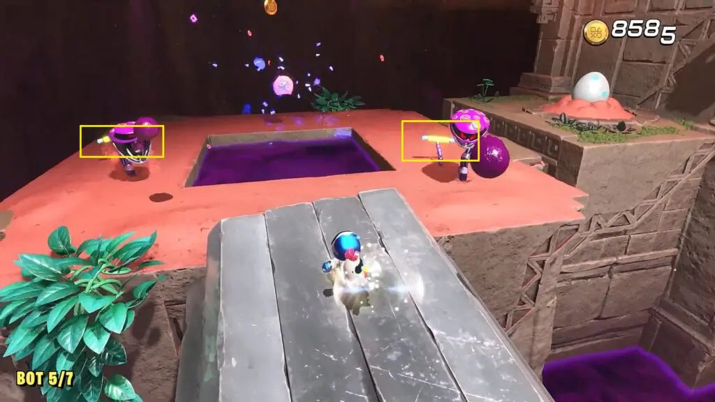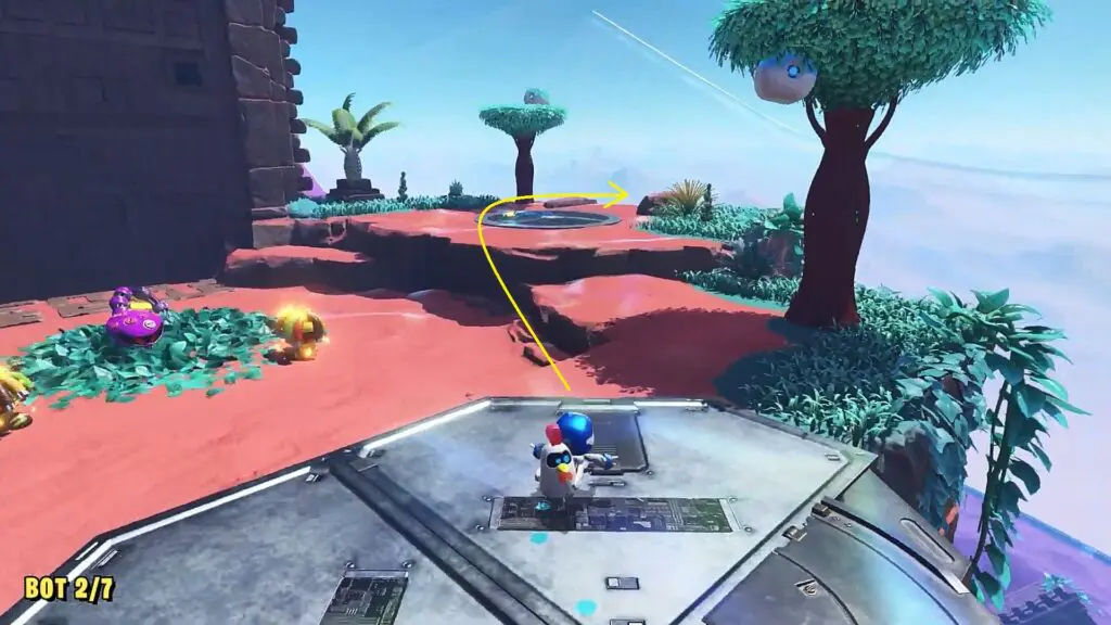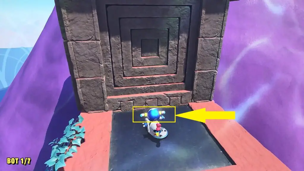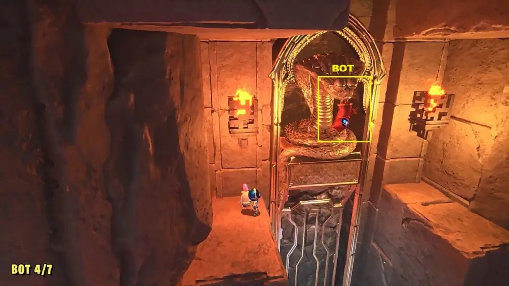 Proceed ahead and pull the yellow chain from the column to make it a bridge. Cross the bridge and pull the two yellow chains as shown in the picture below to defeat the two snakes. This will create a blue light at the center as shown in the second picture below. Stand on the blue light and spin to reach the room underneath. Rescue the bot there.
