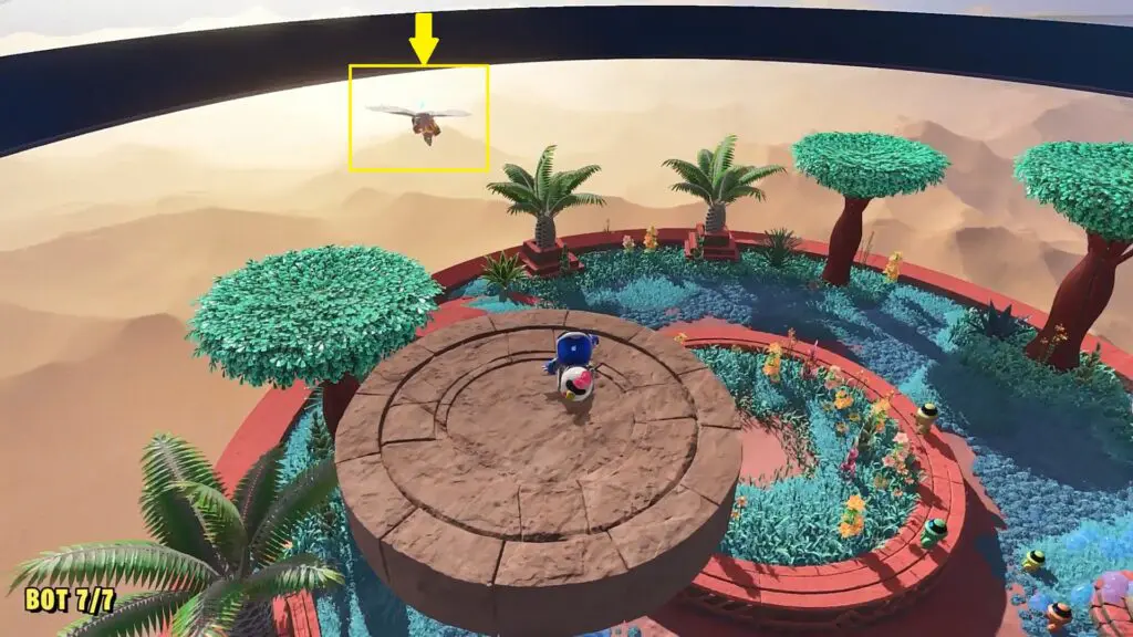 Continue in the level until you reach the topmost area. There you will see a bird flying around carrying a bot as shown in the picture below. Jump to the top platform to hit and rescue the bot.
