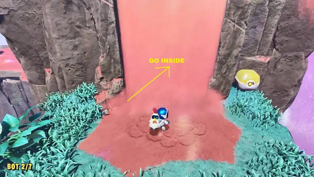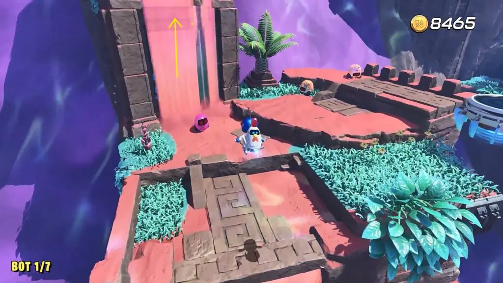 Proceed ahead and soon you will have to go through the bottle shown in the picture below to reach the upper level. Then go towards the right edge and drop down from the location shown in the second picture below. Then walk through the sandfall there as shown in the third picture below to reach the bot.