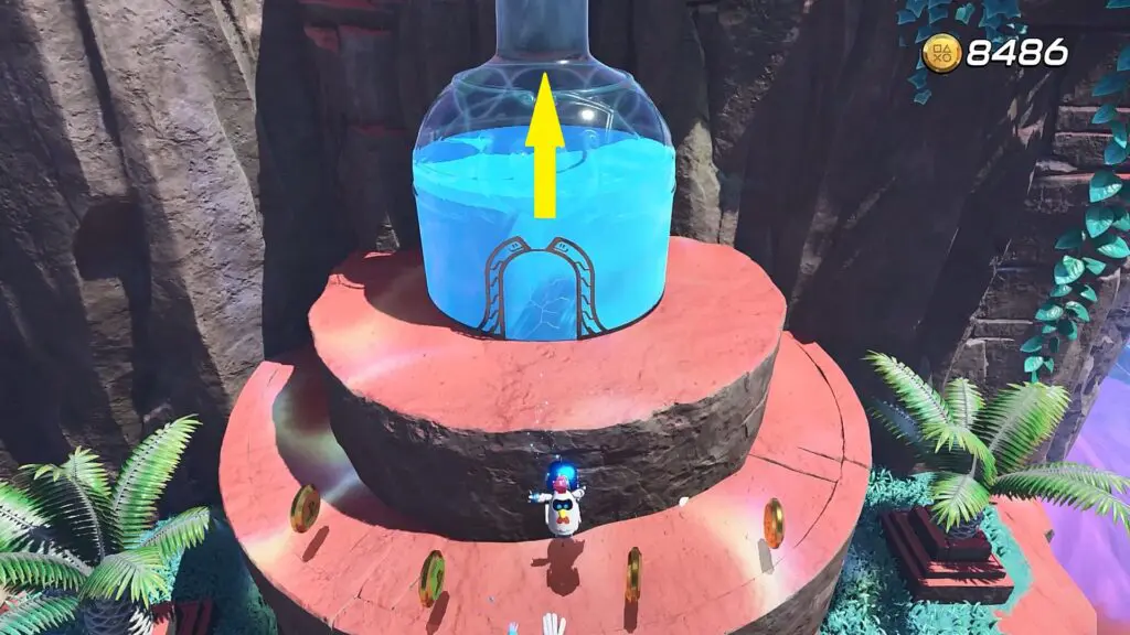 After getting Bot#2, go back up and flood the area. Then use the leaves on the wall to climb to the upper level. From there, you will be able to see another bottle, with a puzzle piece inside it as shown in the picture below. Jump to reach the bottle. Then break it and go inside to get the puzzle piece.