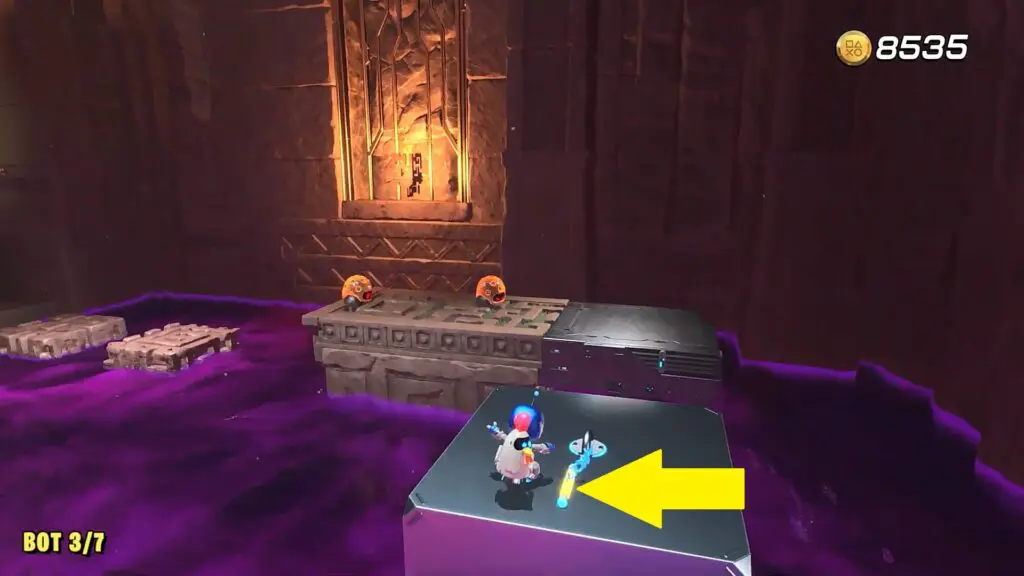 Proceed ahead and soon you will reach an indoor area. As you enter, go right and you will see a rotating cube with a yellow chain on it as shown in the picture below. Jump on the cube and pull the yellow chain to rescue the bot.