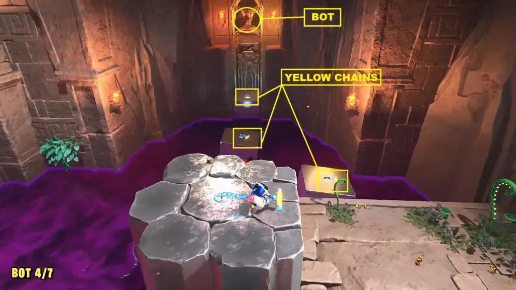 On the opposite wall of this area, you will see a snake sculpture with a bot hanging from it as shown in the pictures below. To reach the bot, you need to pull the yellow chains from the three cubes as shown in the picture below. Pull the yellow chain from one cube. Then jump to another and pull its chain and then to the third one. This will take you to the snake sculpture. Jump and hit the bot to rescue it.