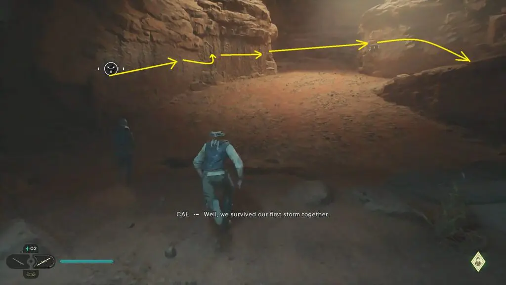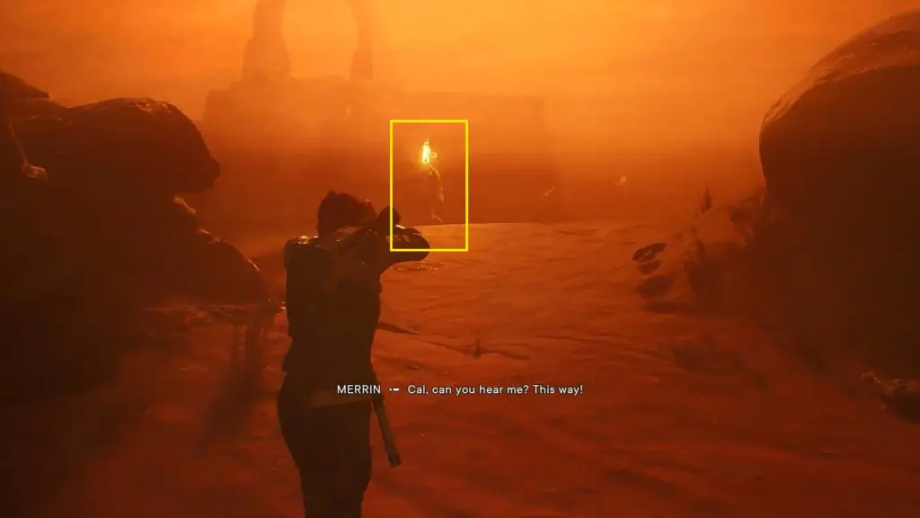 Proceed in the sandstorm and you will find Merrin carrying a torch as shown in the picture below. Follow Merrin and eventually, you will arrive in an area full of enemies. Defeat them and then fight the AT-ST there. Keep following Merrin and she will lead you to Sheltered Hollow as shown in the second picture below.