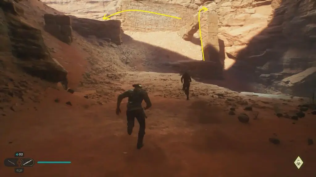 Keep following Merrin and soon you will arrive to a slippery path. Run on the wall on the left side, then grapple to the wall on the right. Keep running on the wall and jump down at the end to land on the surface as shown in the picture below.