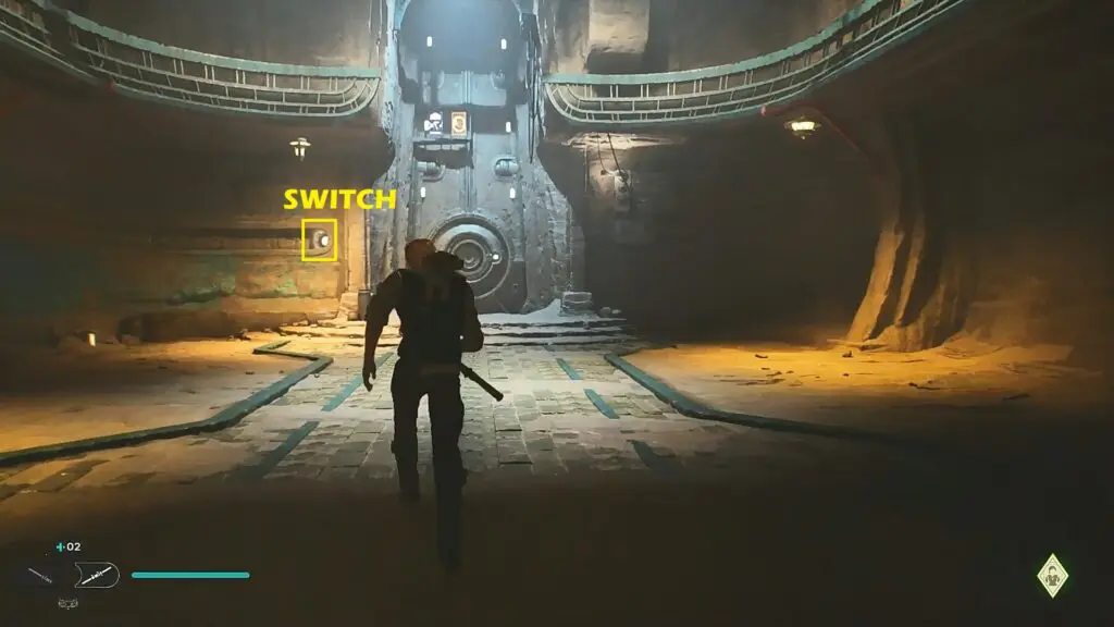 Follow Merrin and soon you will reach another slippery path. Climb on the pillar on the right side. Then run on the wall to reach the surface above as shown in the picture below. Follow Merrin and she will lead you to Veiled Hangar’s entrance door as shown in the second picture below. Push the button at the center of the door to open it and go inside.