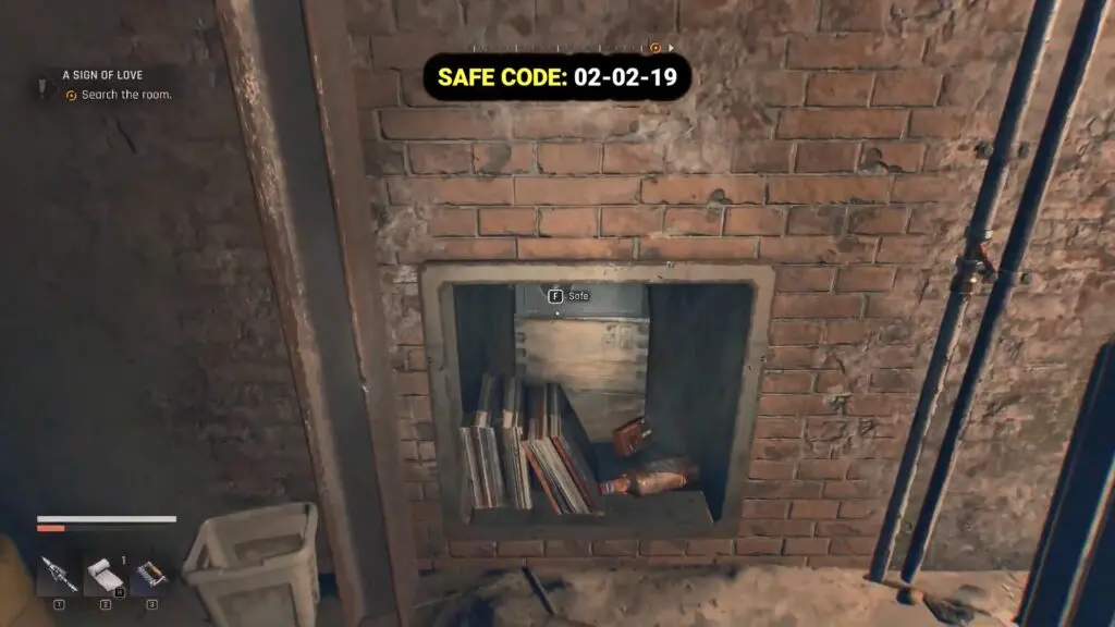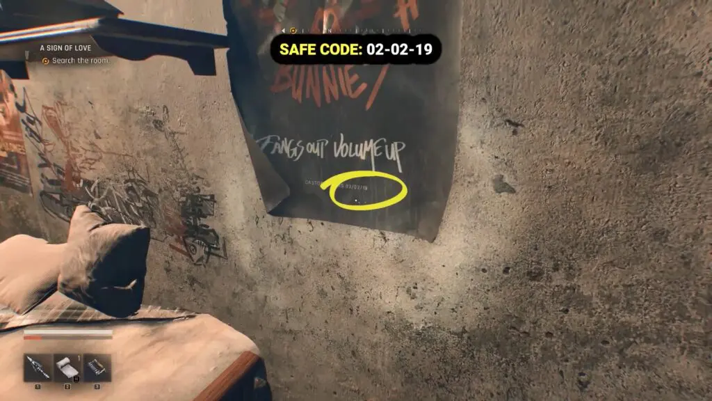 With the lights back on, head to the cell near the fuse box. On the wall between the bed and the table, you’ll spot a poster. Inspect it to reveal the safe code: 2-2-19.