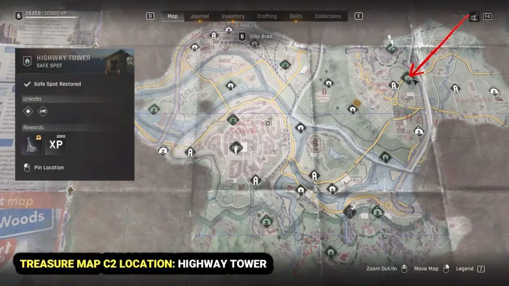 The treasure map is located at the very top of the highway tower. You’ll find the treasure map sitting on a ledge. Refer to the map.