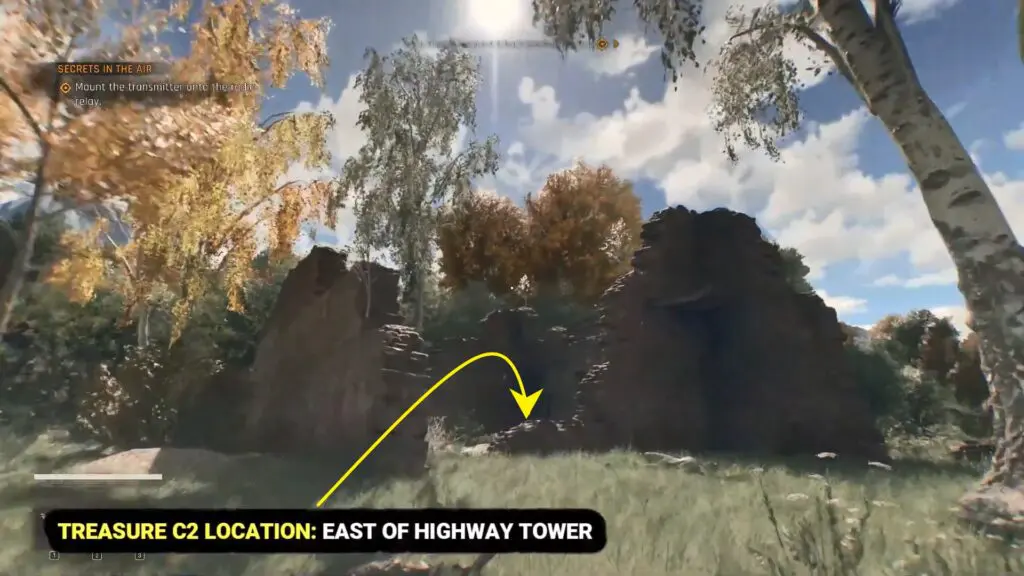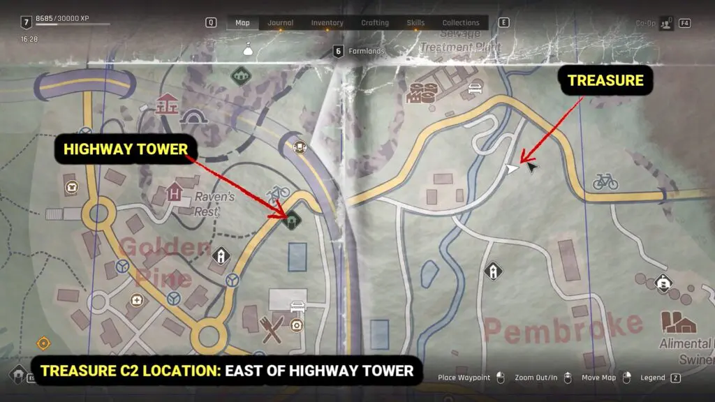 To get this treasure, go east from the Highway Tower and a little south of the Sewage Treatment Plant to reach the ruins. Use your map to find the spot.