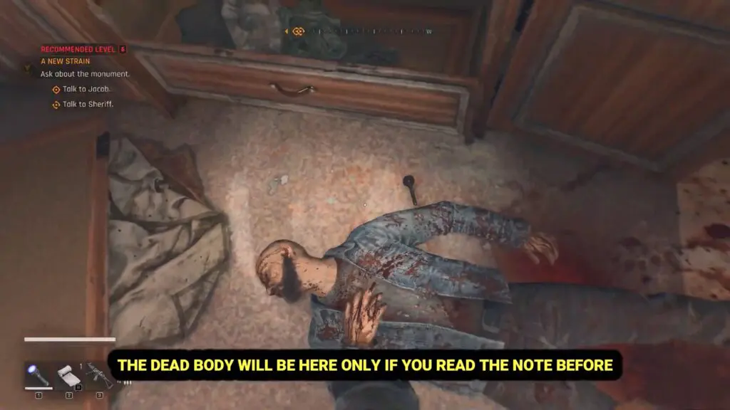 Before you can get the key, look for a note on the side table in the same room. Reading this note is important, as it will trigger the appearance of a corpse holding the key.