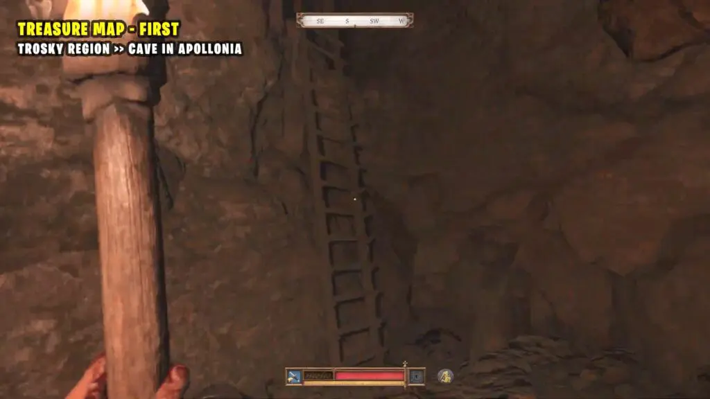 Enter the cave and follow the path until you come across a ladder. Climb up the ladder to reach a room containing a locked chest.