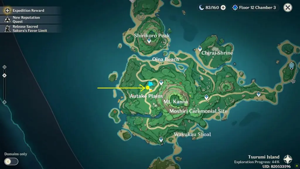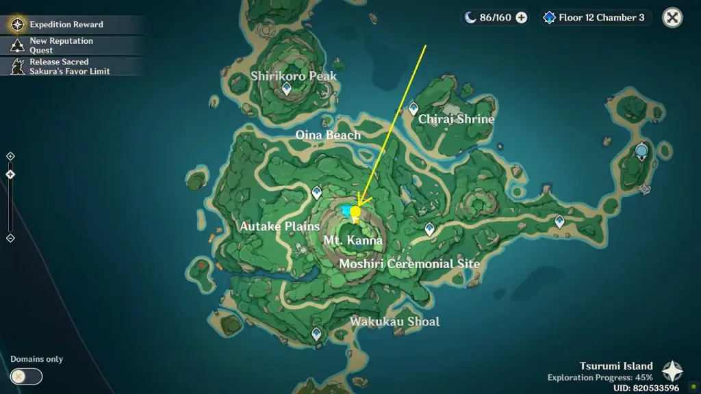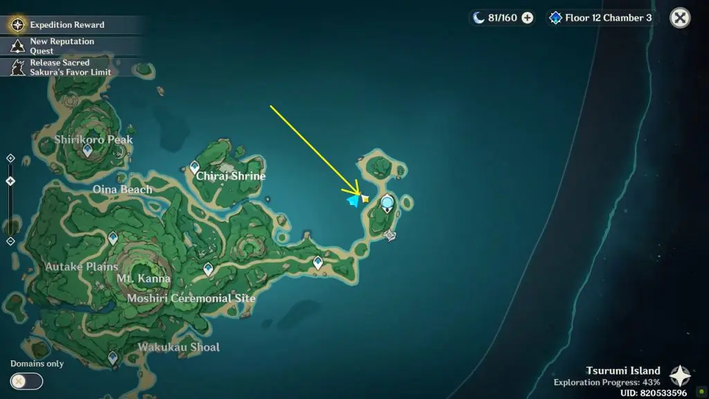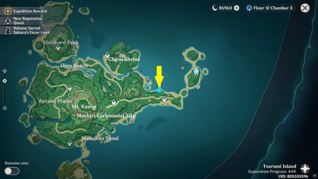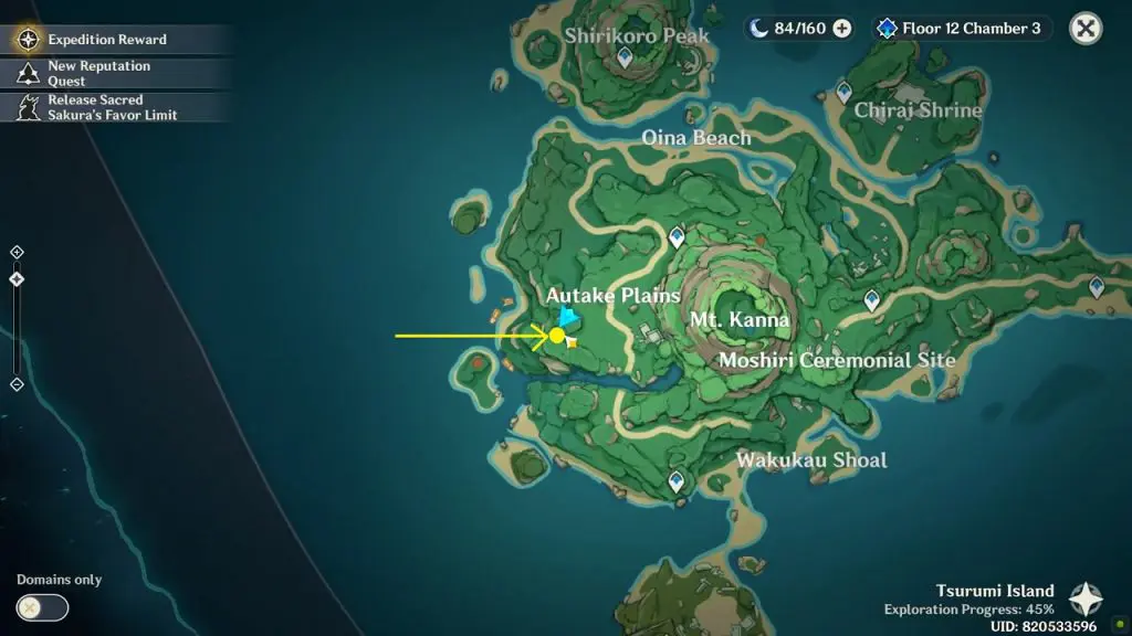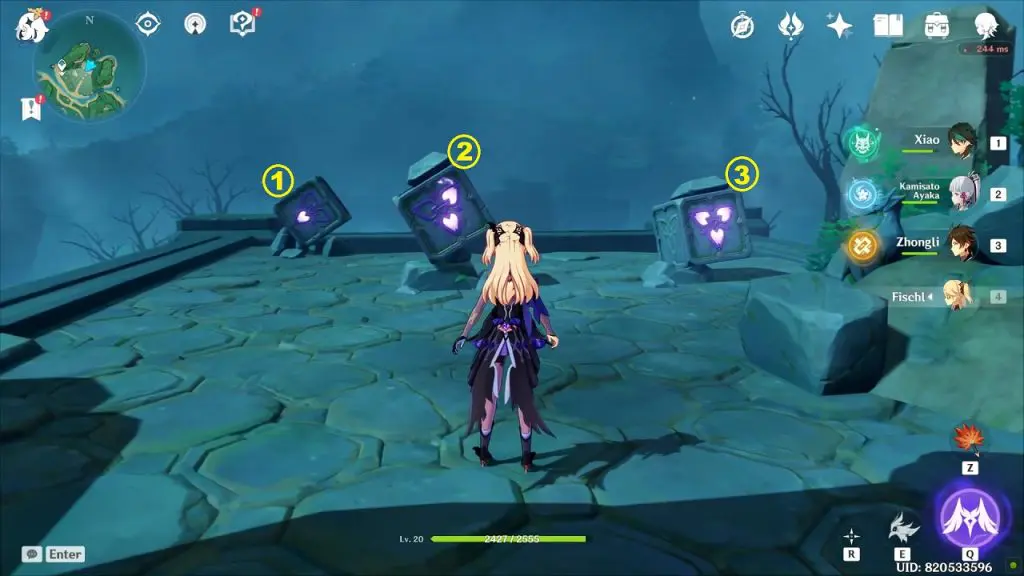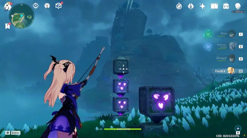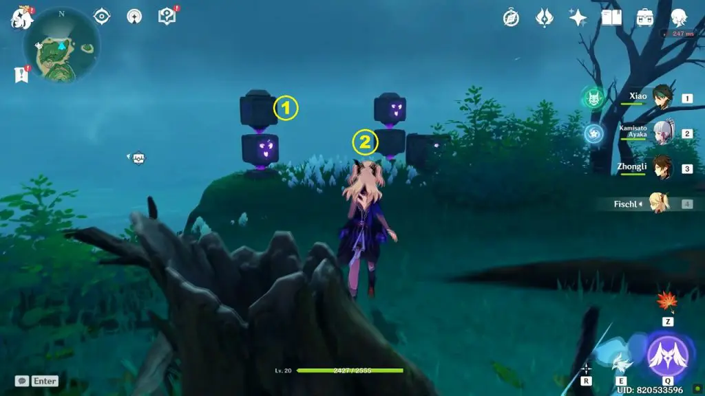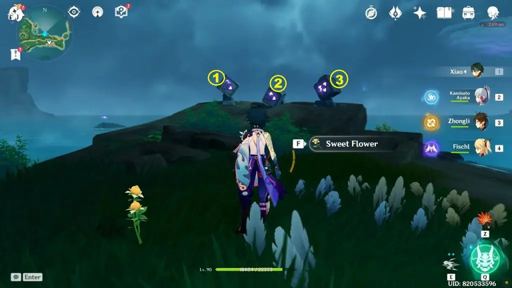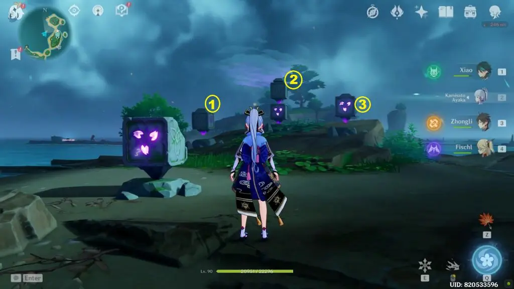 You will find 5 rotating cubes at the northern edge of Tsurumi island as shown below. Make all the glowing sides face the southern direction to solve the puzzle. Hit the cubes numbered 1 & 2 in the picture below three times each to solve the puzzle and get a common chest.