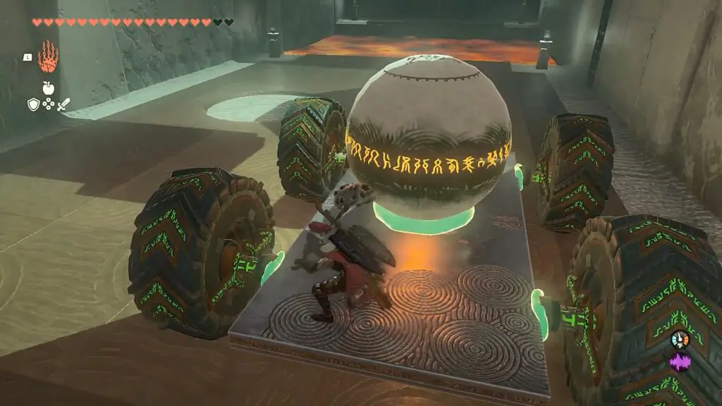Enter the shrine and go straight ahead. Then climb down the ladder at the end. There you will find a sphere. Use the Ultrahand ability to place the sphere on the cart as shown in the picture below. Climb up the cart and hit the wheel. This will make the cart move and carry the sphere across the lava.