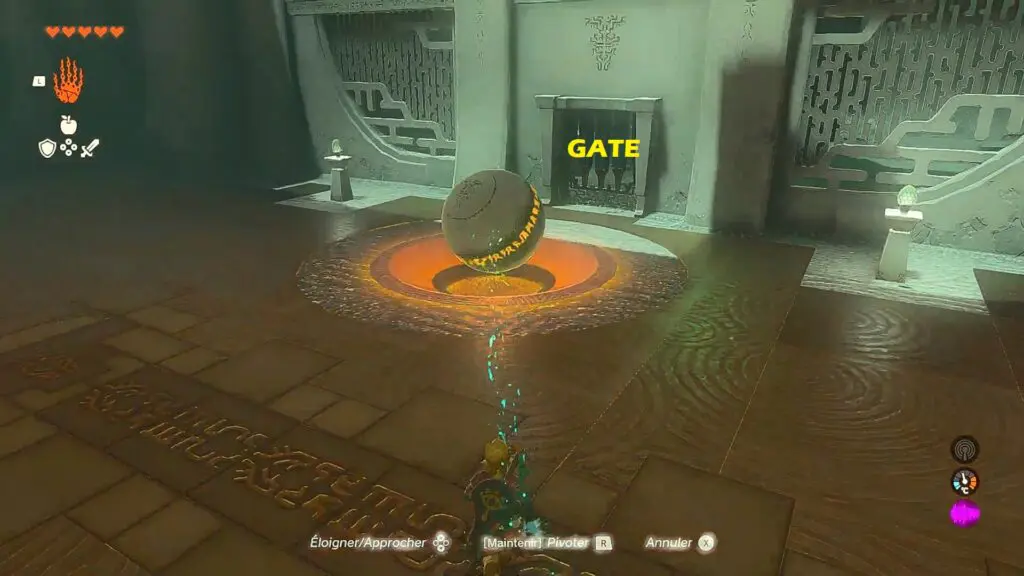 Go across the gate. Then pick up the sphere and place it into the hole in the ground as shown in the picture below. This will open the iron gate in front of it. Go through the gate and interact with the symbol there to complete the shrine.