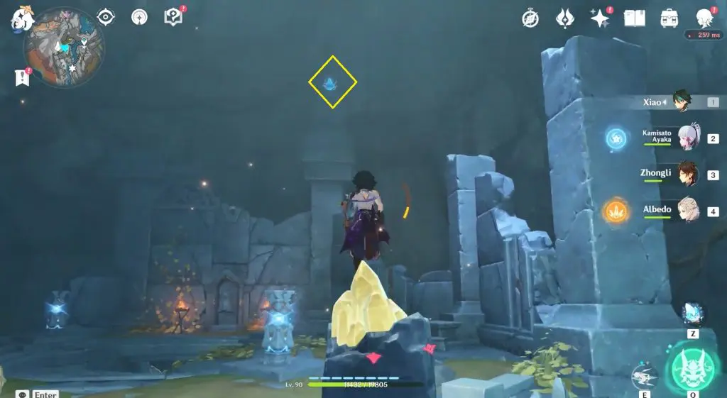 This can be found on the top of a ruined structure southwest of the teleport waypoint. This is the same location you must have visited to fulfill the world quest Perils in the Dark’s objective “Ring the two bells on either side of the ruins.” The Lumenspar is perched atop a pillar.