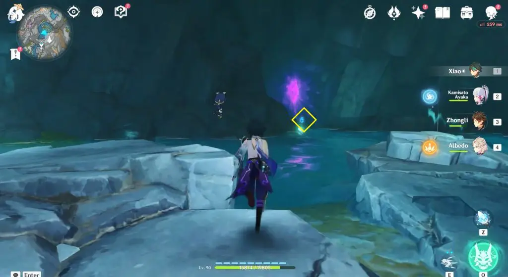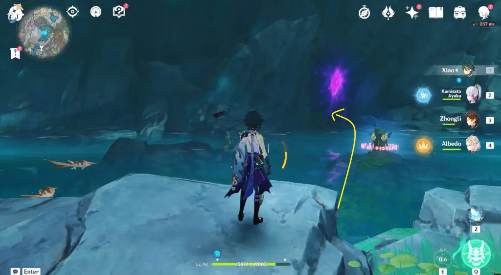 Another purple door can be found on the western wall of the same area. Open the purple gate and dive into the massive hole. Glide to the bottom to locate the Lumenspar.