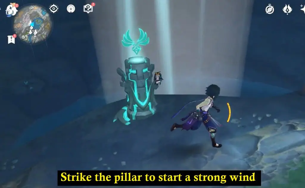 Use the stone to launch into the air and glide to the other side where you can find a green pillar. Strike the pillar to start a strong wind that can blow you up.