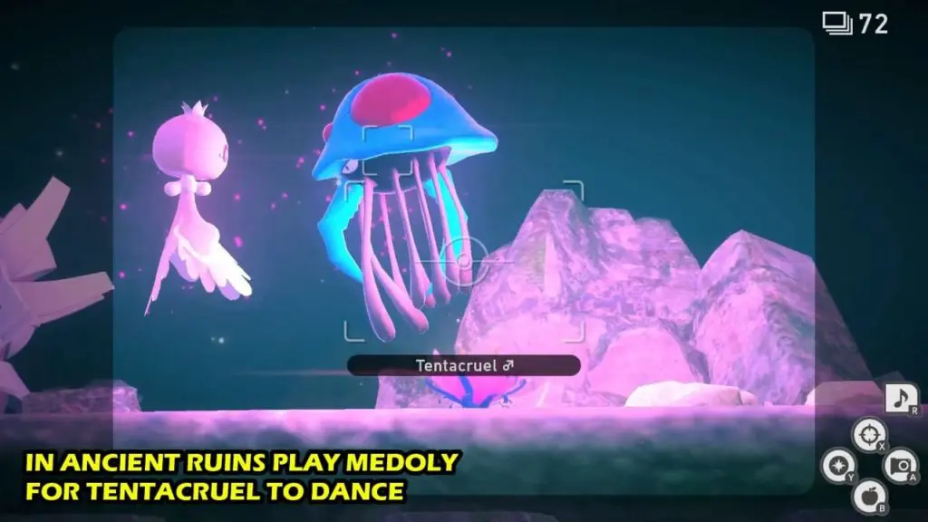 Undersea Ballroom Dancing: New Pokemon Snap (How to Guide) Post published:May 4, 2021 Post category:New Pokemon Snap The request is to take a 4 Star of Tentacruel by making a Male Tentacruel dance. Tentacruel 4 Star Pose: How to Clear Undersea Ballroom Dancing Request Guide:Visit Lental Seafloor (undersea) at research level 2.Take the alternate route that leads to the underground ruins.While descending down, hit the MALE Tentacruel with orb and play the melody. Male Tentacruel will start moving towards the ancient ruins.In ancient ruins, you will find the Male Tentrcruel with Frillish (near crystalbloom).Play the melody to make the Male tentacruel dance & Snap a 4-star picture to complete the request. RELATED: New Pokemon Guide & Walkthrough