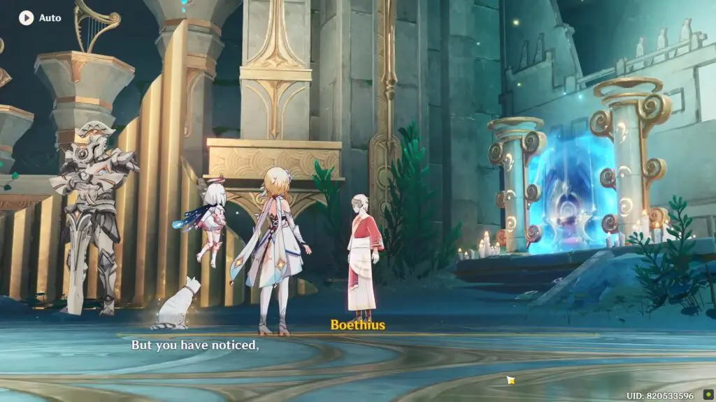 Glide down on the stage below and interact to play the Symphony on the mural. This should trigger a cutscene with another NPC named Boethius.