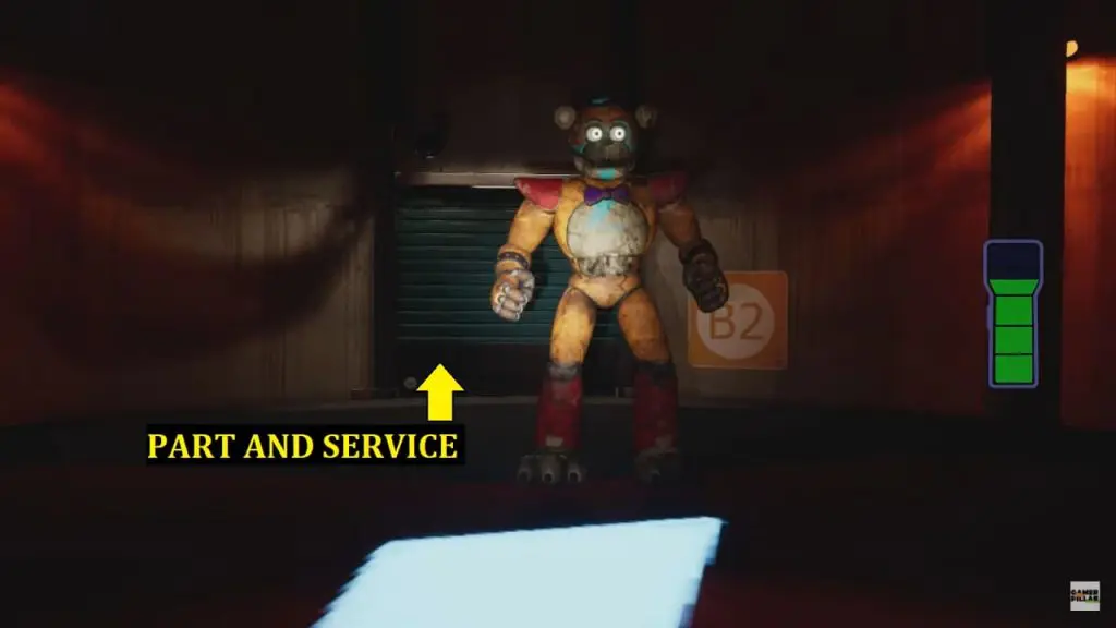 After leaving Roxy Raceway head to Level-1. Push the button on the main stage and this will take you down to Basement-2. Enter the door with the B2 sign and sprint towards the two red doors. This will lead you to Parts and Services. Refer to the below images for reference.