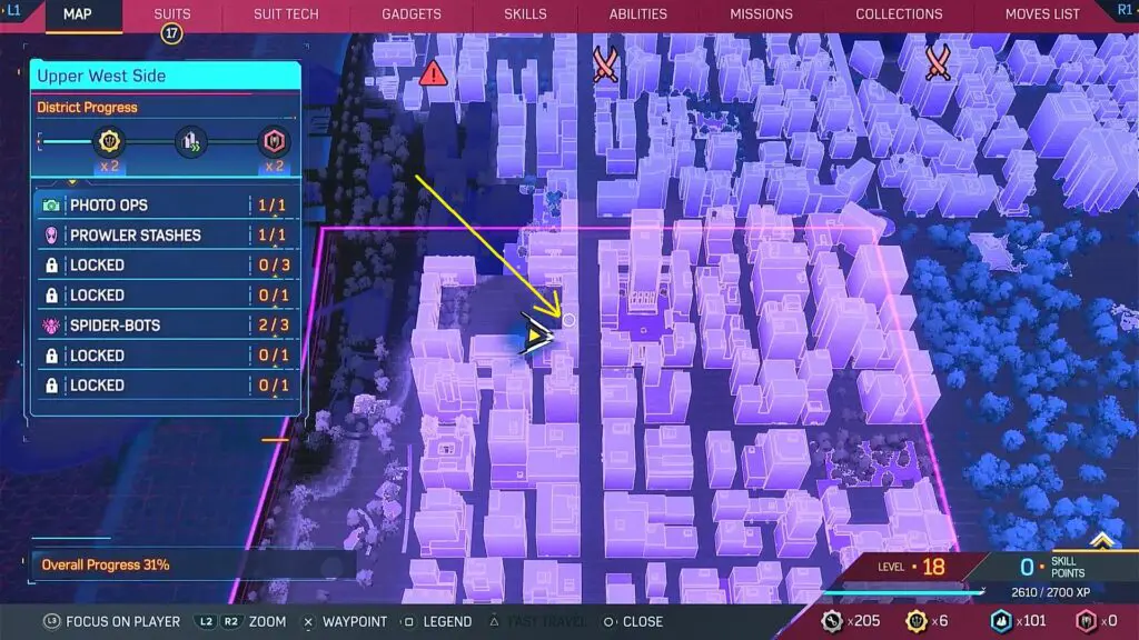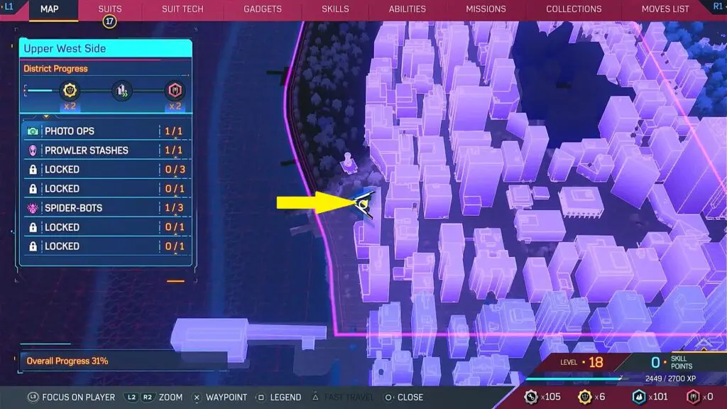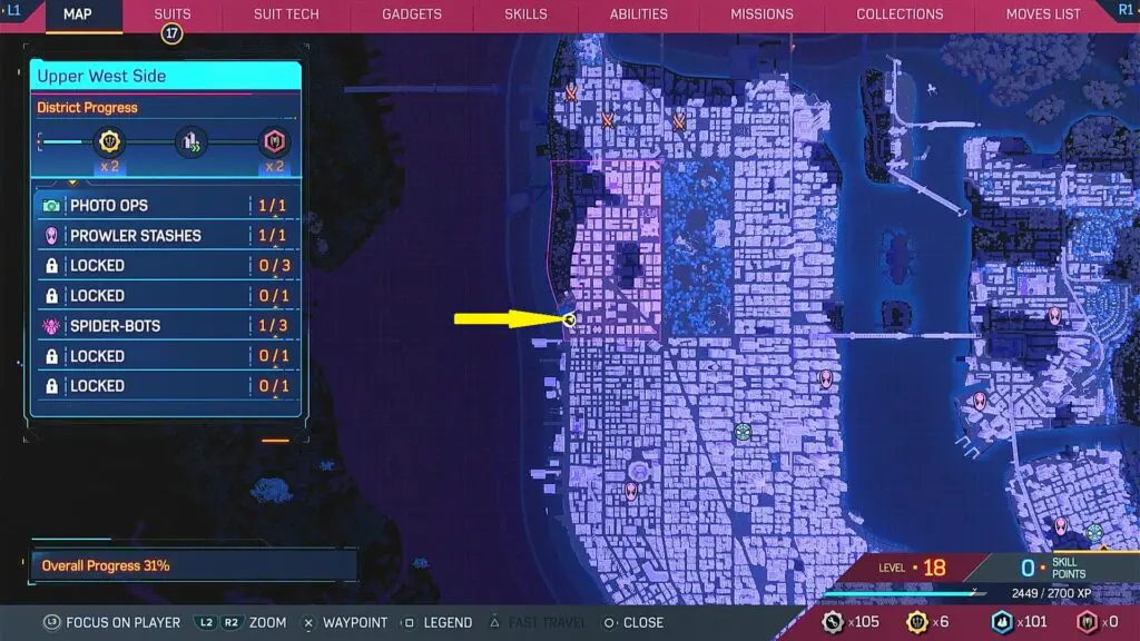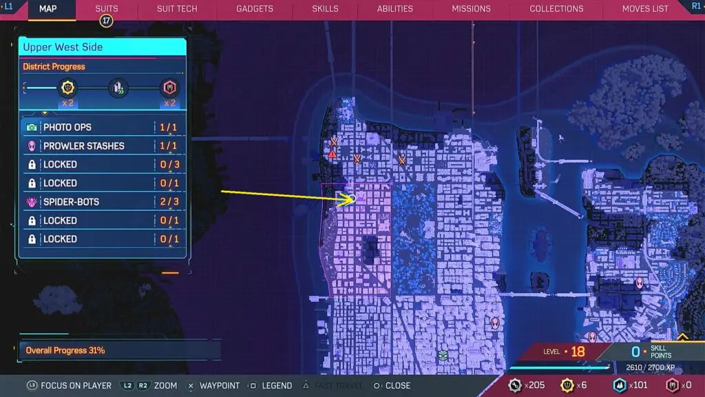 This guide shows the location of all Spider Bots in the Upper West Side district in the Spiderman 2 game, which released on 20 October 2023.