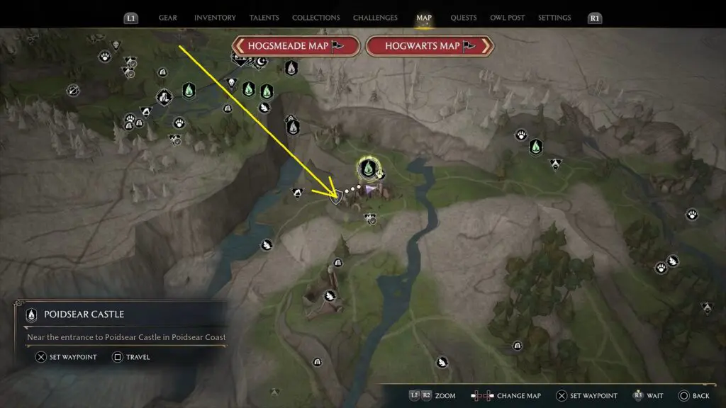 The objective will start after you pick up Henrietta’s Map kept on a table near the Poidsear Castle Floo Flame as shown in the pictures below.