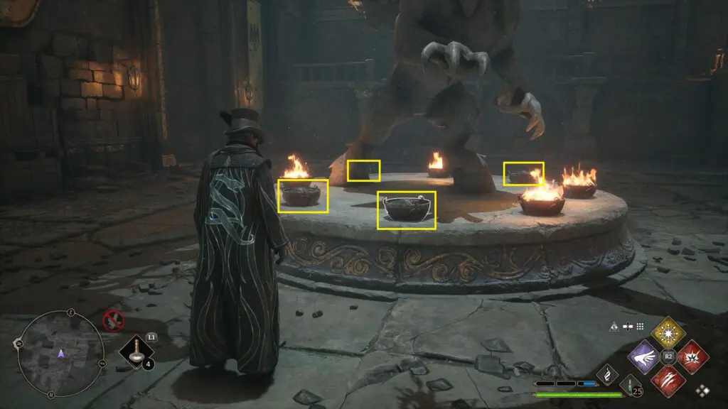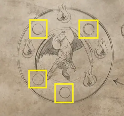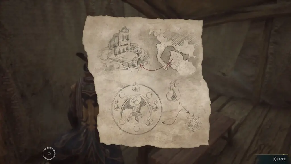 Proceed ahead to the next area and defeat all the enemies there. In this area, you will see a giant Hippogriff Statue at the center, with torches around it. Here the treasure map clue will come into play. As per the map, you need to light some of the torches and freeze the others as shown in the pictures below. First, use any fire spell to light up all the torches. Then freeze the torches as shown in the second picture below using the Glacius Spell. This will solve a puzzle and a wall will move it the room to reveal a chest. Open the chest to complete the quest.