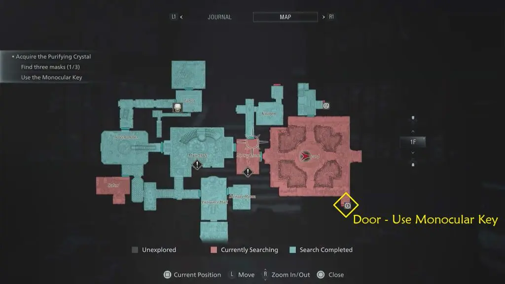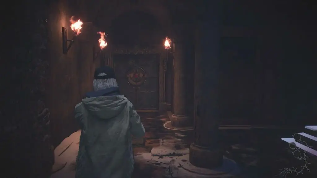 Return to the courtyard with the monocular key in your possession. You can use the monocular key on a creepy-looking red-eye door in the courtyard’s corner.