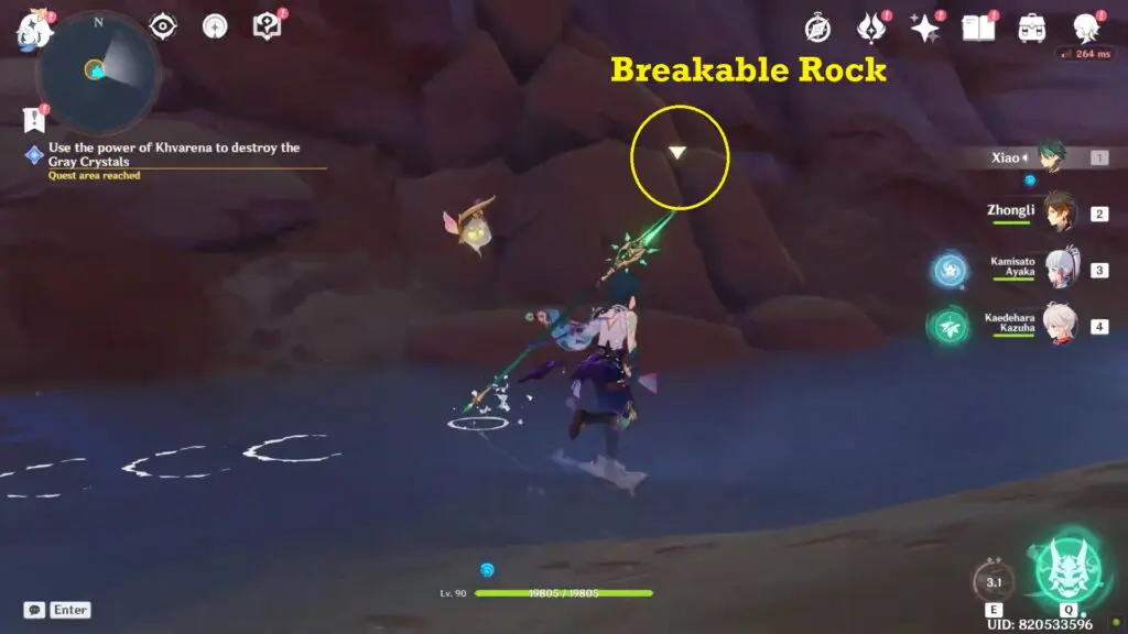 In order to break the gray crystals, you must first release Khvarena and follow it like you would a Seelie. Khvarena resembles a green flying Seelie with wings. To free Khvarena, you need to find and break the rock that is located nearby. The rock will be indicated by a small arrow to ensure that you do not miss it. To break the rock, you will need to use a powerful character.