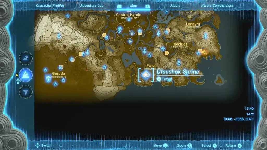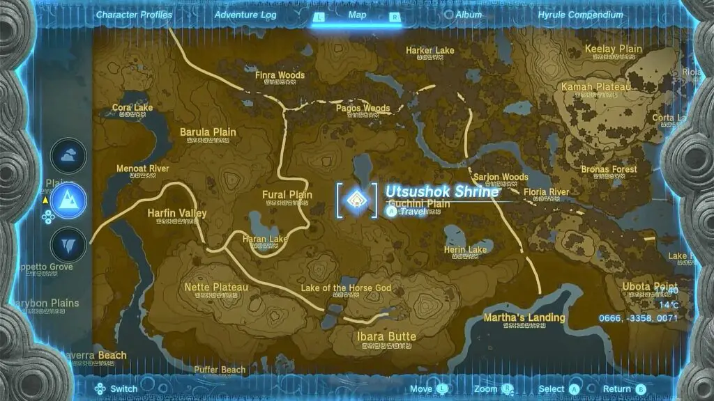 This guide shows the complete walkthrough of the Utsushok Shrine in the Legend of Zelda: Tears of the Kingdom game, released on 12th May 2023. The Utsushok Shrine is at the location shown in the pictures below.