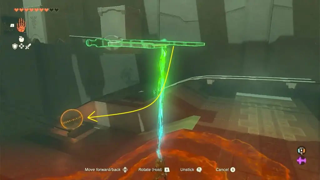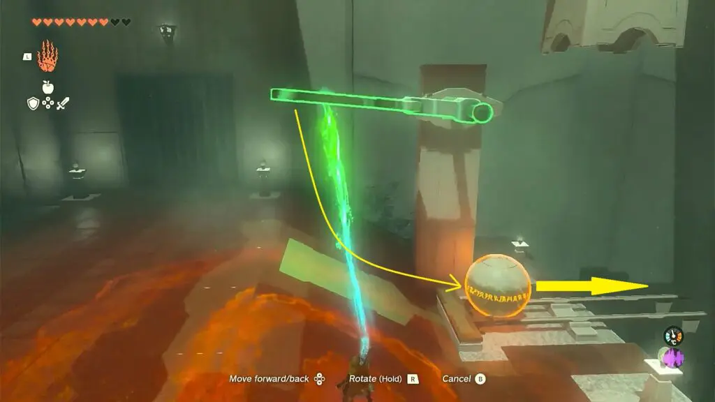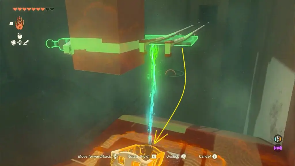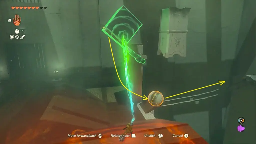 Proceed ahead into the next room. Grab the box there and attach it to the bottom of the paddle. Use the Ultrahand ability to lift the paddle as shown in the picture below and then release it. As it comes down, it will hit the ball, pushing it forward. The ball will go and fall into the hole ahead, opening the iron gate.