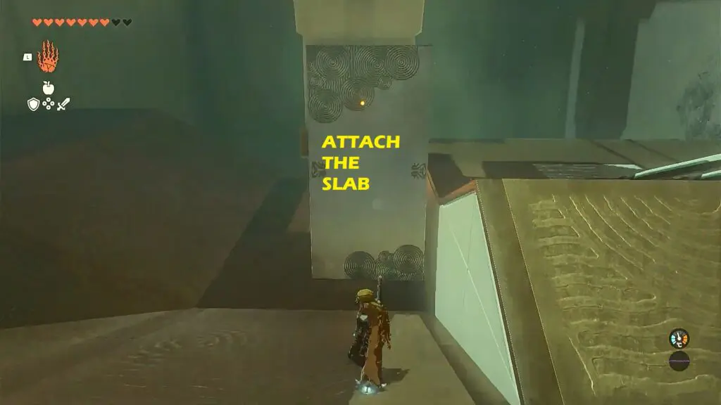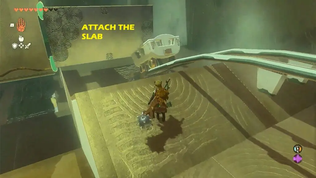 Proceed ahead into the next room. Grab the slab there and attach it to the bottom of the paddle as shown in the picture below. Use the Ultrahand ability to lift the paddle as shown in the second picture below and then release it. As it comes down, it will hit the ball, pushing it forward. The ball will go and fall into the hole ahead, opening the iron gate. A cart will come out from the iron gate and roll down to the bottom of the rails.