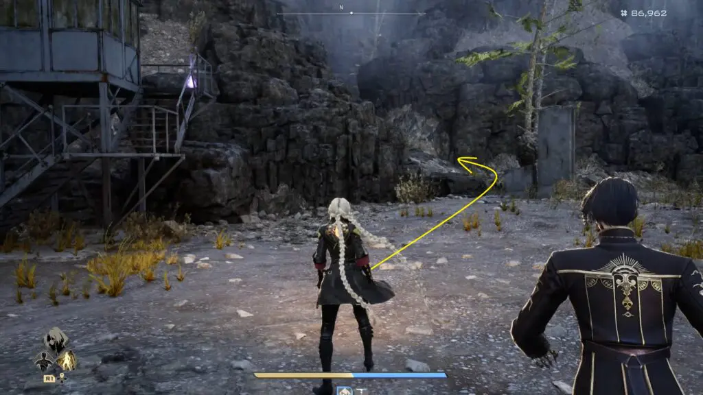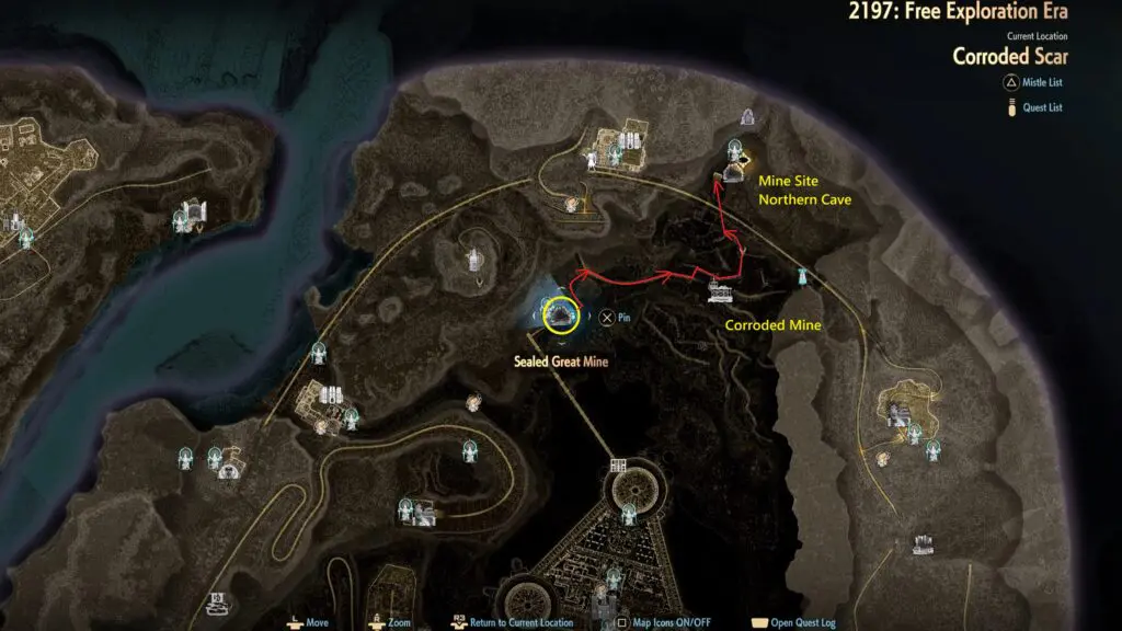 This uphill route leads directly to the entrance of the Mine Site Northern Cave. Enter the cave and activate the Mistles point. From there, continue deeper into the cave, following the main path until you reach the Corroded Scar Temporal Rift location.