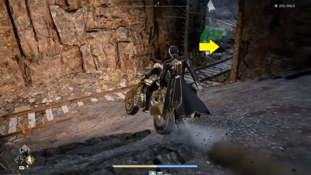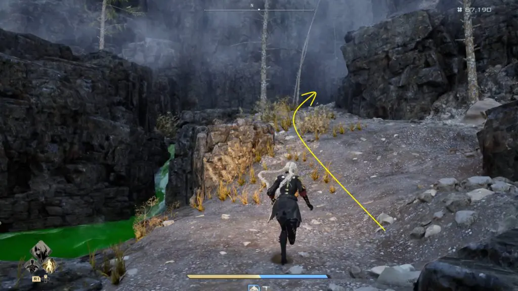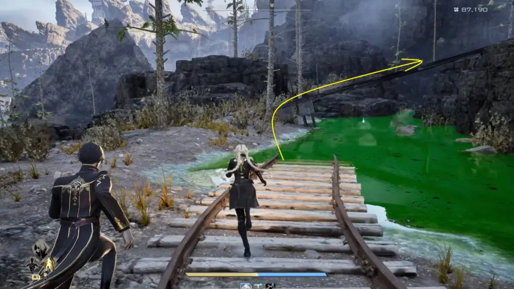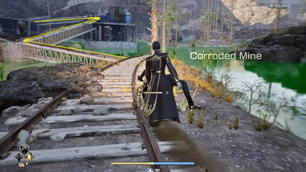 Once inside the Corroded Mine, look for a makeshift bridge and carefully cross it to reach the northern side. After crossing, keep moving north and begin climbing the uphill path ahead.