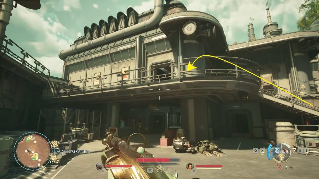 Leave Marshal Donelson’s office and go to the Zyranium-infested Primary Repair Hangar. Just follow the path along the left wall to reach the Hanger. With the Gas-Energy Deflection Apparatus in your hands, you can now step inside the Primary Repair Hangar. But be cautious with Zyranium gas. The shield from the device won’t stay up for long, so hurry through the area before it fades.