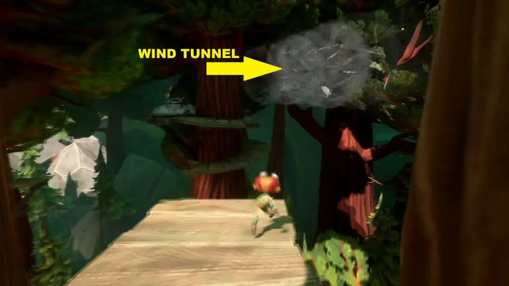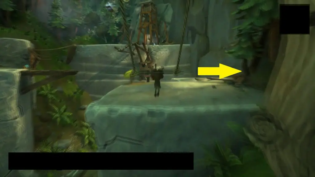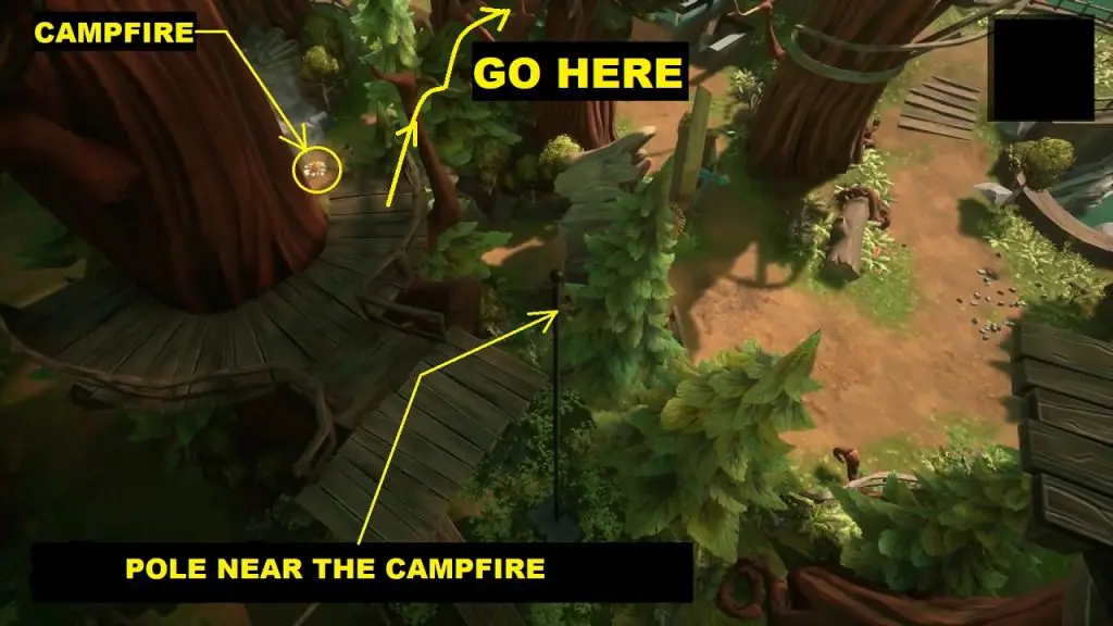 This one is in the Questionable area. Go to the campfire in the Forgetful forest. In this region, you will find a pole leading to a platform on the tree as shown in the picture below. Climb the pole and then jump to the platform. On one side of the platform, use the branches to jump to the platform on the other side as shown in the picture below.
