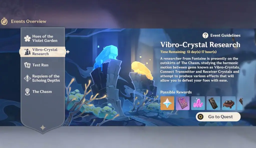 During the event, help the Fontaine researcher who has come to Liyue to study the harmonic motion between gems known as Vibro-Crystals. During the first 6 days of the event, one new challenge will be unlocked each day.