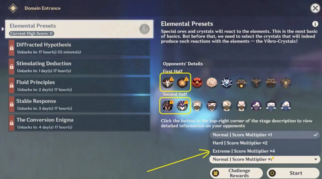 After speaking with Patrice, you have to choose the stage and the difficulty before entering the Vibro-Crystal Setup. The higher the difficulty, the more points you’ll get. All six stages will have different domain details and enemies!