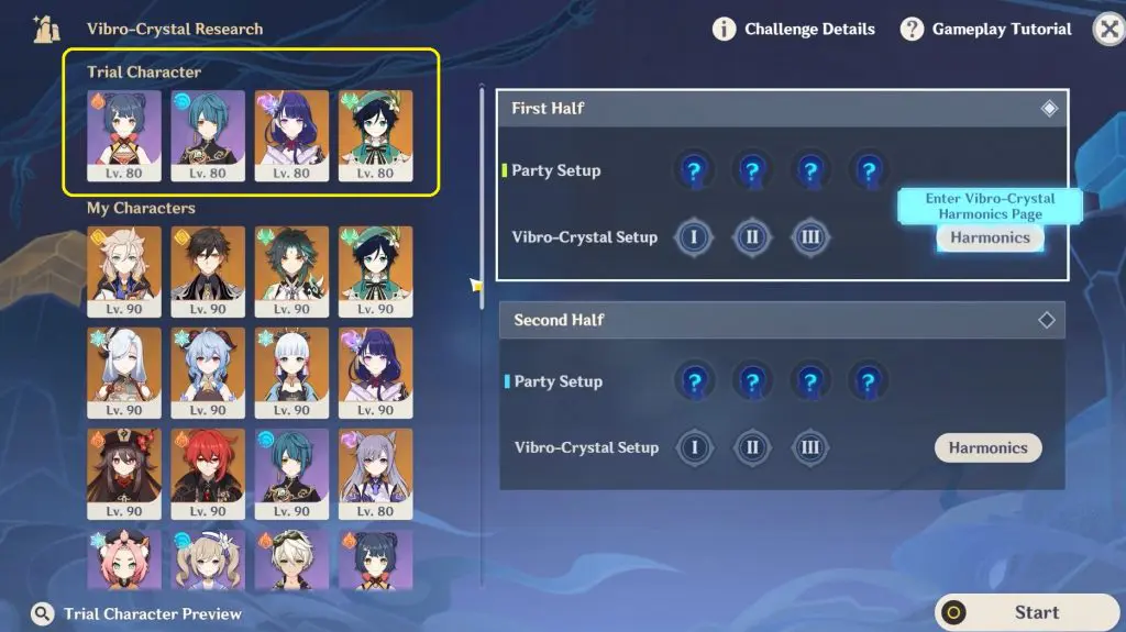 The challenges are split into a first half and a second-half. Here you need to set charcter for both the half. You can use characters provided by the event (trial character) or your own to form. Trial characters to use during the event, including are Venti, Raiden, Xiangling and Xingqiu.