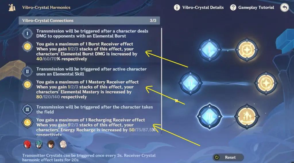 Receiver Crystals are the ones that give the buff once you’ve triggered them using the Transmitter Crystals. Various buffs will appear per stage as shown in below image.