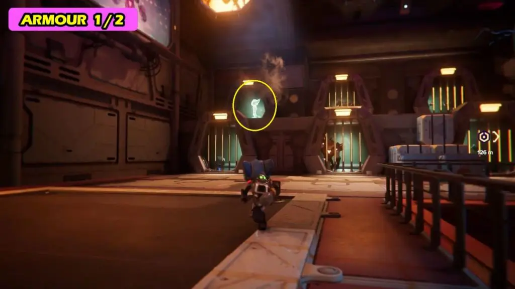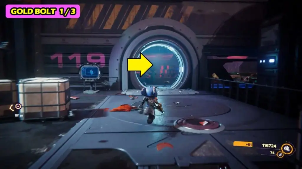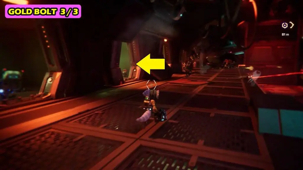 The first gold bolt can be collected during the objective “find the others”. After meeting Ms. Zurkon (weapon vendor), pass through the checkpoint and follow the path to the right (Note: Use a phantom dash to pass through the checkpoints). The gold bolt is in the room on the extreme right (east) side.